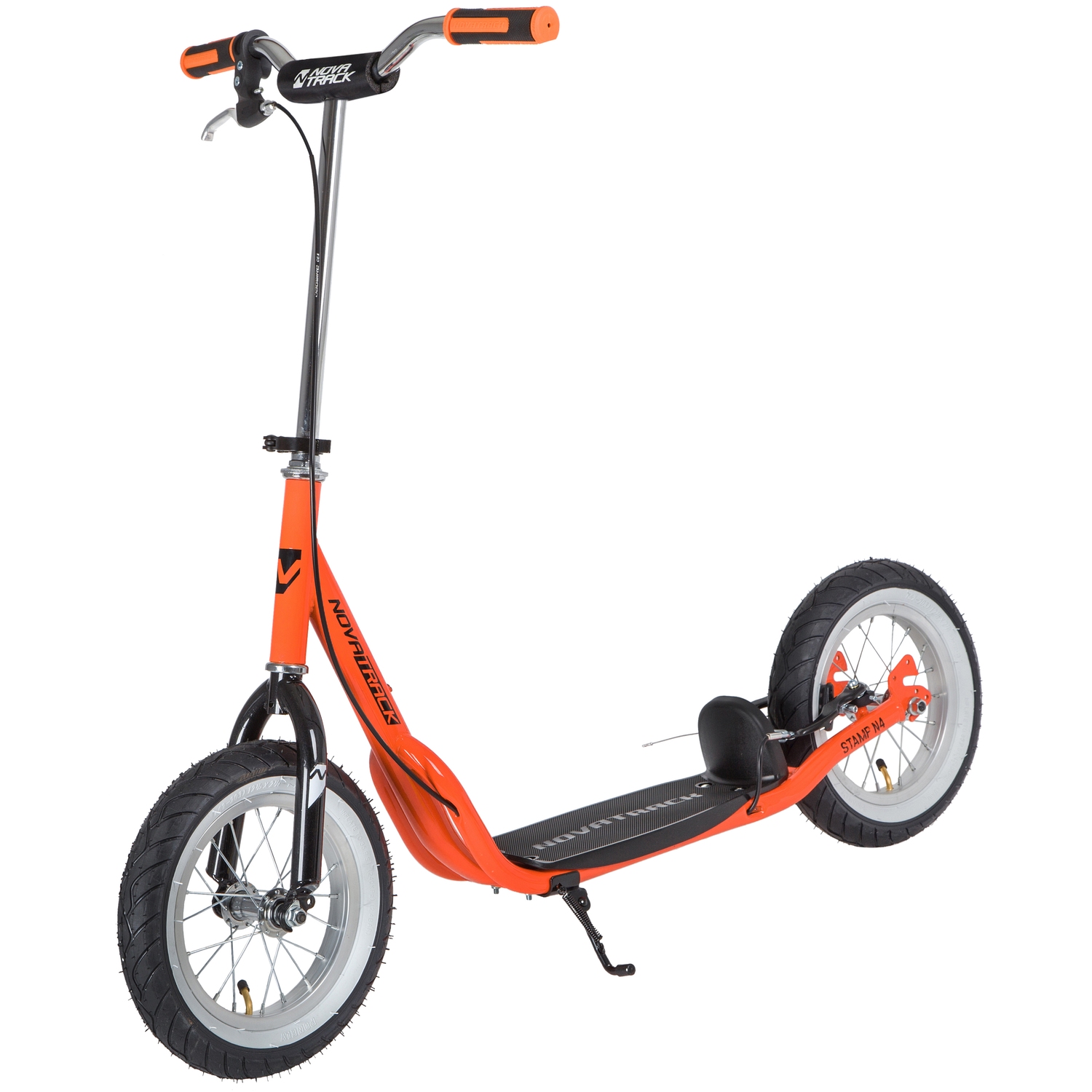 Самокат Novatrack STAMP N4 порадует всех любителей активного образа жизни. Широкие надувные колеса диаметром 12 дюймов позволят кататься не только по асфальтовым дорожкам, но и с легкостью преодолевать парковые тропинки. Надежные передний и задний ручной тормоз обеспечивают безопасное торможение даже с очень крутой горки. Надувные колеса имеют ряд ощутимых преимуществ. Они бесшумны, с мягкими колёсами поездка будет мягче и комфортнее. Хорошо защищают от неровностей благодаря амортизирующим свойствам. Такие колёса комфортны при езде по неровным дорогам. В дождливую погоду надувные колеса увереннее держатся в поворотах. Они отлично тормозят и не скользят на разных поверхностях. Благодаря отличному сцеплению, помогают развивать более высокую скорость.