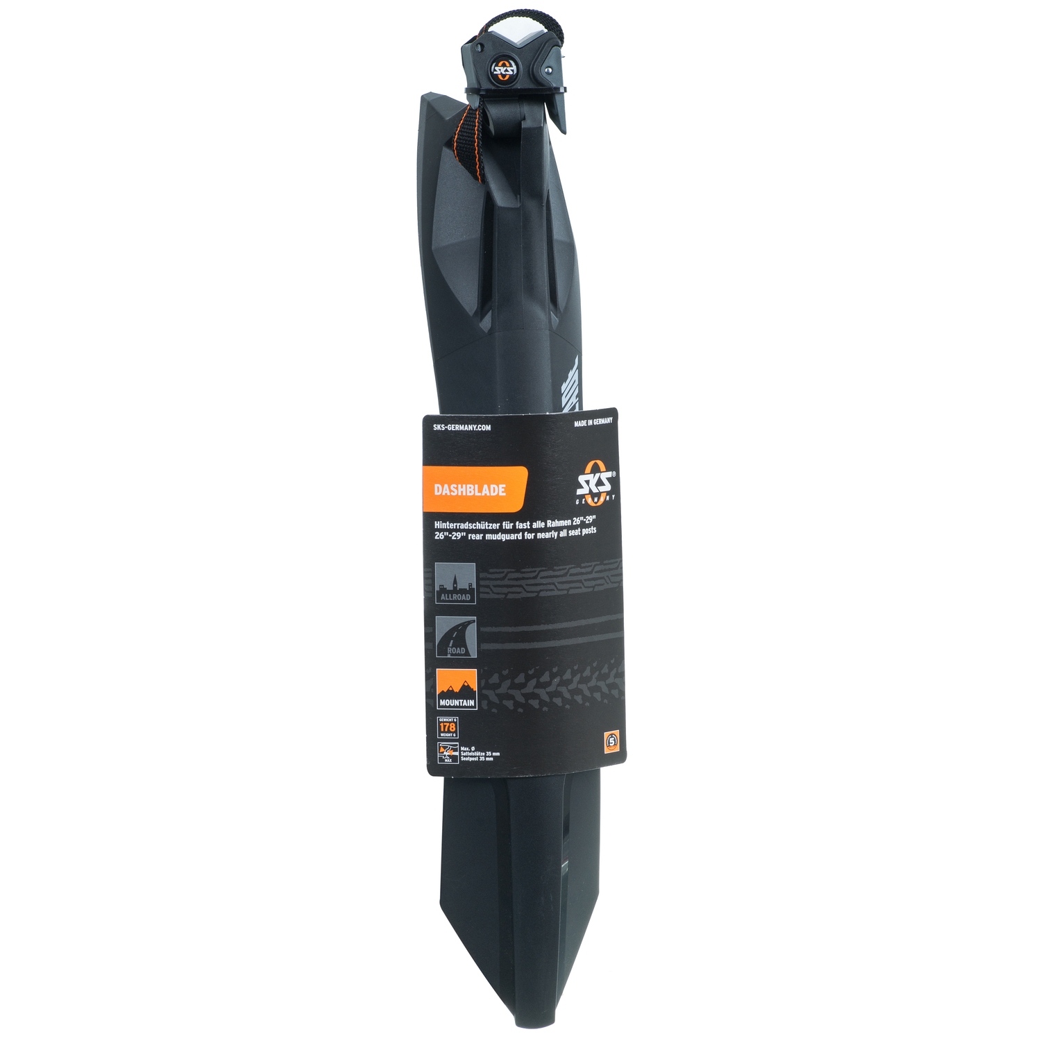 Универсальное заднее крыло SKS Dashblade с креплением за подседельный штырь для велосипедов с колесами 26-29 дюймов.
