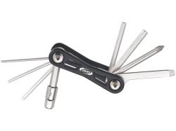 Прочный мультитул с легким алюминиевым корпусом станет полезным помощником для велосипедиста, который всегда с собой. Двойной шестигранный ключ не будет сниматься во время использования. Многофункциональный инструмент оборудован 9 функциями шестигранные ключи 2, 2.5, 3, 4, 5, 6 и 8 мм. Крестовая и плоская отвертка.