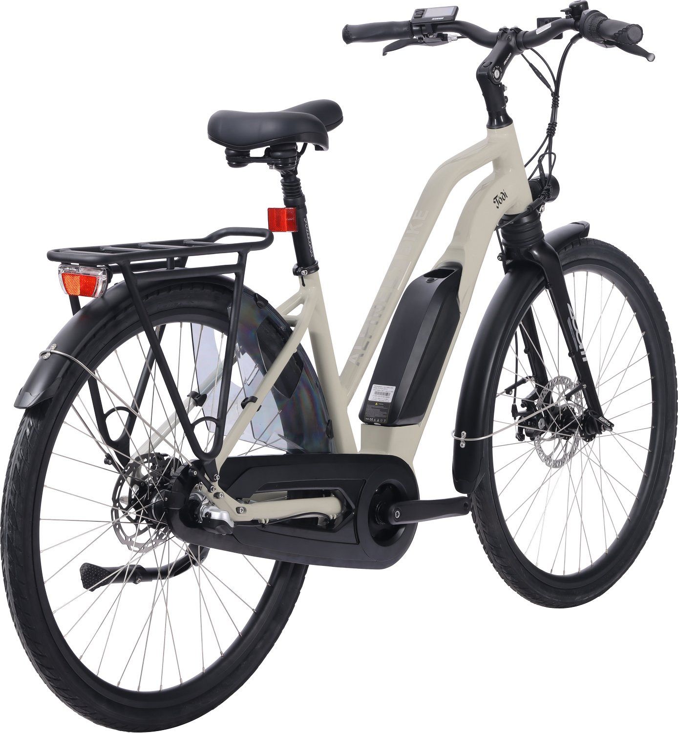 Alpinebike Todi также оснащён выносливыми колёсами и амортизационной вилкой, обеспечивающими плавный ход даже на неровных поверхностях. Система переключения скоростей Shimano Nexus 3 позволяет легко адаптироваться к различным условиям, а встроенные фонари, крылья и защита добавляют безопасности во время поездок.