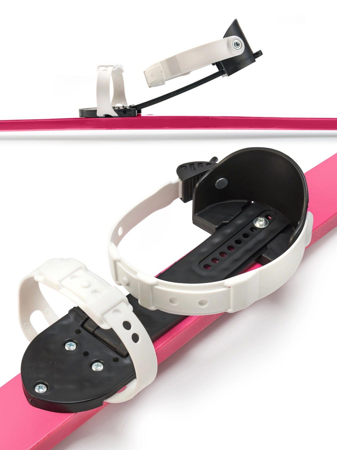 Универсальные пластиковые крепления регулируются под размер обуви ребёнка от 28 до 37, обеспечивая надёжную фиксацию стопы, аналогичную фиксации в лыжных ботинках. Это делает комплект удобным для использования с повседневной обувью.